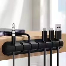 A minimal cable clip designed to hold charging cables, earbuds, and wires in place so they don't slide off your desk or get tangled.